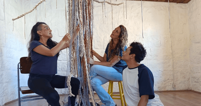 “Com ele tivemos o prazer de realizar um encontro. Aliás, durante o processo, outros aconteceram. Recebemos a visita da artista Drica Santos e de Ingrid Sateré-Mawé, que mediaram espaço de partilha, no contínuo exercício de descolonizar nossos modos de estar, de pensar, de agir e de olhar para o mundo. Claudia Sachs e Bárbara Biscaro conduziram um trabalho formativo em bufonaria, que nos possibilitou abrir camadas em nossas figuras (Palhaça Esmeralda, Palhaça Gretta e Palhaço Jubi). Já Marina Monteiro, atuou na condução da dramaturgia do espetáculo, guiando a equipe durante a criação do roteiro da obra”, contou Débora.