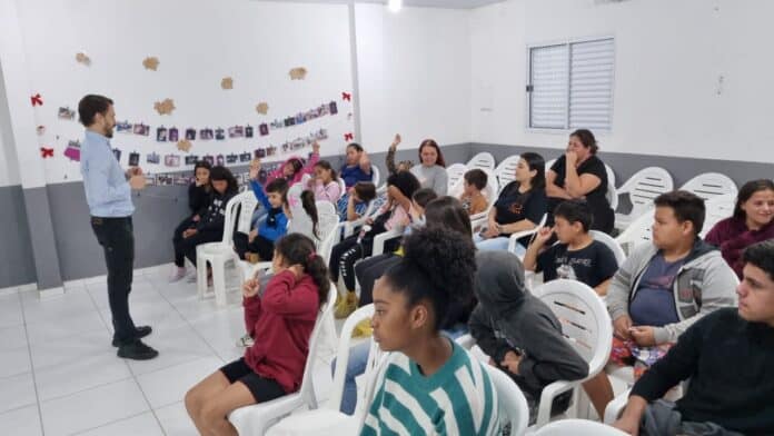 Legenda foto: Pablo Rossi em atividade de educação musical da OFiC com crianças do Centro de Atendimento e Desenvolvimento Integral de Palhoça
