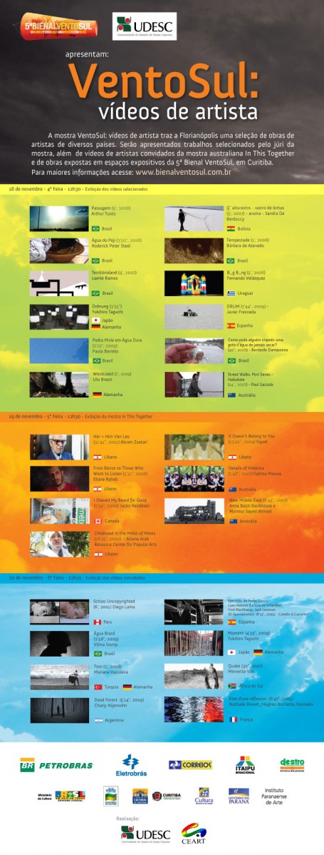 A UDESC e a 5ª Bienal Vento Sul promovem entre os dias 18 e 20 de novembro a mostra Ventosul: vídeos de artista no Auditório do Bloco Amarelo do CEART. Com uma seleção de obras de diversas nacionalidades feita pelo júri, além da exibição da mostra australiana Is This Together e vídeos convidados, o evento apresenta um breve resumo da produção de vídeo no Brasil, Bolívia, Espanha, Uruguai, Alemanha, Austrália e Japão, com contribuições do Líbano, Canadá, França, África do Sul, Argentina e Peru.
