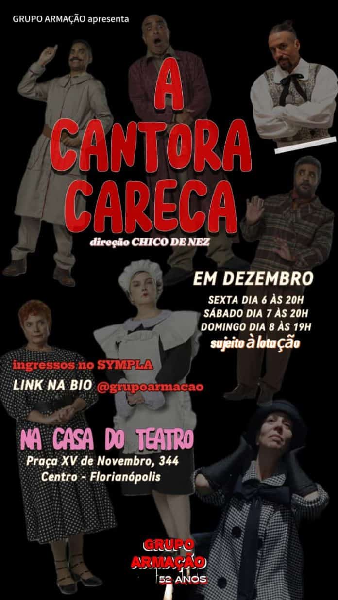 Após o sucesso da estreia do espetáculo “A cantora careca”, o Grupo de Teatro Armação realiza uma curta temporada de apresentações na capital, na Casa do Teatro, prédio histórico localizado em frente à Praça XV de Novembro. Com direção de Chico De Nez, a peça apresenta uma crítica à hipocrisia da sociedade burguesa ao questionar as normas e as convenções sociais da época, mas que por vezes torna-se atual frente à falta de comunicação e futilidades presentes nas relações.