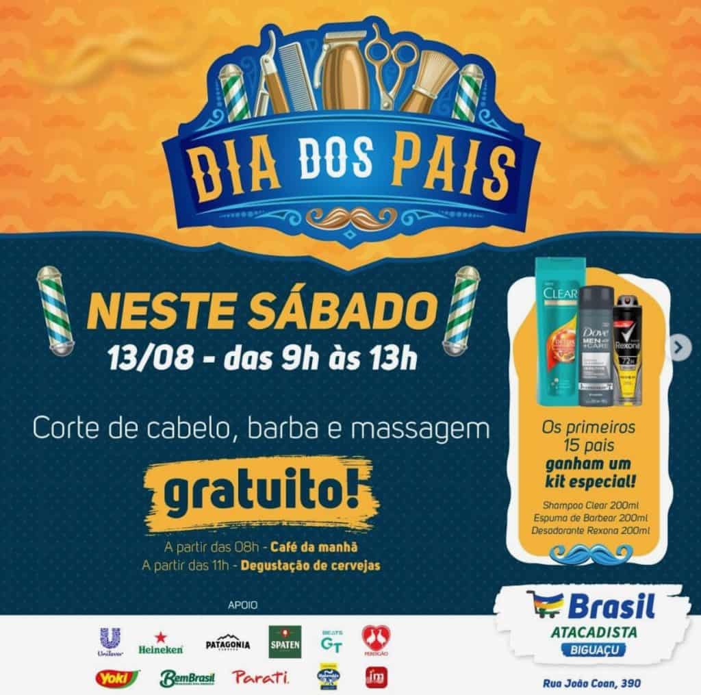 O Brasil Atacadista presenteia os pais com uma ação especial para que fiquem ainda mais felizes na comemoração de seu dia. Neste sábado, das 9h às 13h, eles poderão cortar o cabelo, aparar a barba e receber uma massagem corporal, tudo de graça, em parceria com barbearias locais. Os 15 primeiros atendidos recebem ainda um kit com shampoo Clear, espuma de barbear e desodorante Rexona.
