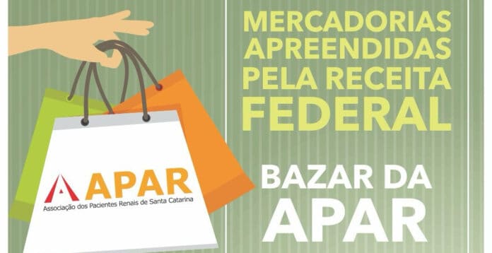 Nos dias 20 e 21 ocorre mais uma edição do bazar solidário promovido pela Associação dos Pacientes Renais de Santa Catarina – APAR, com produtos apreendidos e disponibilizados pela Receita Federal. A ação será realizada no MundoCar Mais Shopping, no bairro Kobrasol, em São José, das 9h às 19h. Serão diversos produtos à disposição do público, como perfumes, artigos do vestuário e de pesca, utensílios de cozinha, além de brinquedos e eletrônicos.