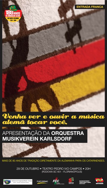 O Teatro Pedro Ivo recebe a Orquestra Musikverein Karlsdorf para apresentação única em Florianópolis. O evento integra as comemorações dos 180 Anos da Imigração Alemã em Santa Catarina, que acontece até março de 2010 com o apoio do Funcultural e do Funturismo, e também será alusiva a 10 ª Semana do Servidor, aberta.