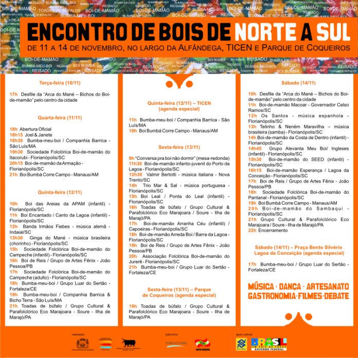Os encontros de folguedos de boi são comuns entre moradores de uma região ou entre regiões de um mesmo município, mas é a primeira vez no Brasil que acontece com abrangência nacional. Florianópolis vai receber grupos folclóricos e parafolclóricos representativos das três principais vertentes deste tipo de folguedo: boi bumbá, bumba-meu-boi e boi-de-mamão, manifestações que possuem uma mesma raiz com influências européias, africanas e indígenas.