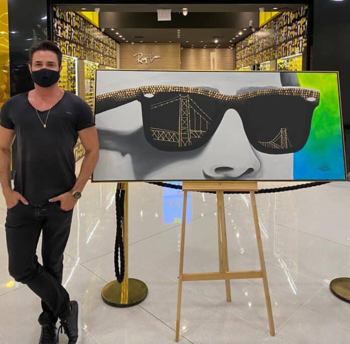 Durante três horas, o artista plástico Paulo Ricardo Campos fez uma live paiting no qual pintou um quadro com a Ponte Hercílio Luz refletida em uma armação de óculos.