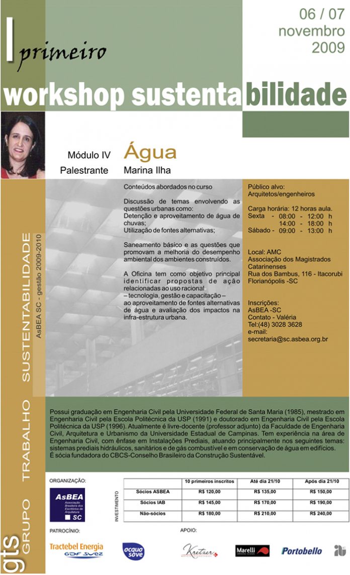 No dia 6 e 7 de novembro, a AsBEA-SC estará promovendo o primeiro Workshop de Sustentabilidade. A pauta será Água com a palestrante Marina Ilha de São Paulo. Serão abordados conteúdos como detenção e aproveitamento de água de chuva, utilização de fontes alternativas, saneamento básico e as questões que promovam a melhoria do desempenho ambiental dos ambientes construídos.