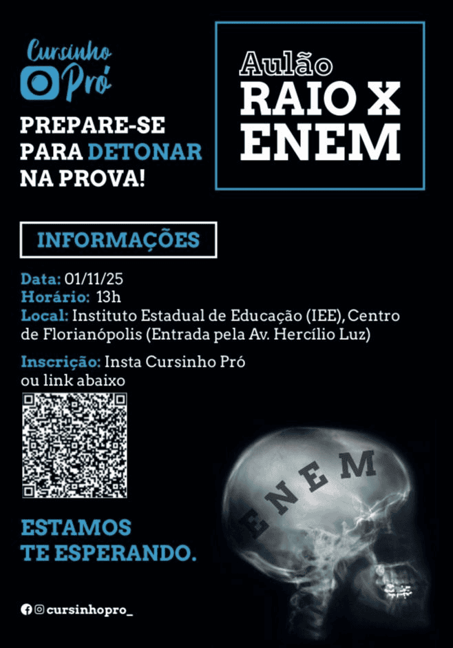 O Cursinho Pró Universidade promove no dia 1º de novembro de 2025, em Florianópolis, o Aulão Raio X ENEM, um grande encontro gratuito voltado para estudantes que buscam uma preparação intensiva e divertida para o Exame Nacional do Ensino Médio (ENEM).