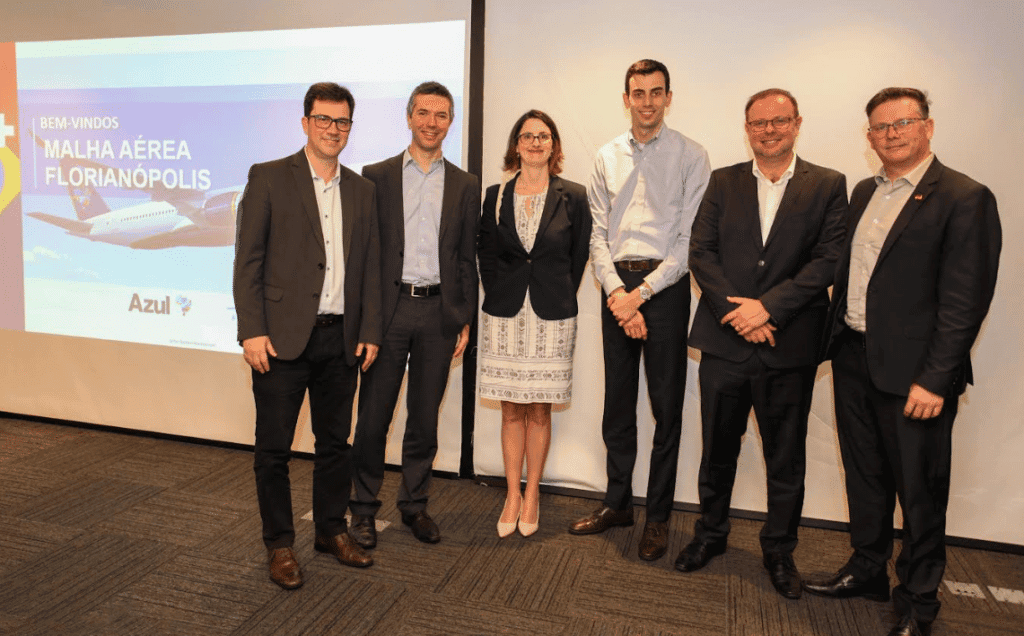 Legenda Foto: Da esquerda para direita, Juliano Richter Pires, secretário Municipal de Turismo, Tecnologia e Desenvolvimento Econômico, Ricardo Gesse, CEO da Zurich Airport Brasil, Tamara Guridi, cônsul-geral do Uruguai em Florianópolis, Fábio Campos, diretor de Relações Institucionais da Azul, Vini de Luca, Superintendente de Turismo de Florianópolis, e Fernando Raupp, secretário de Assuntos Internacionais.