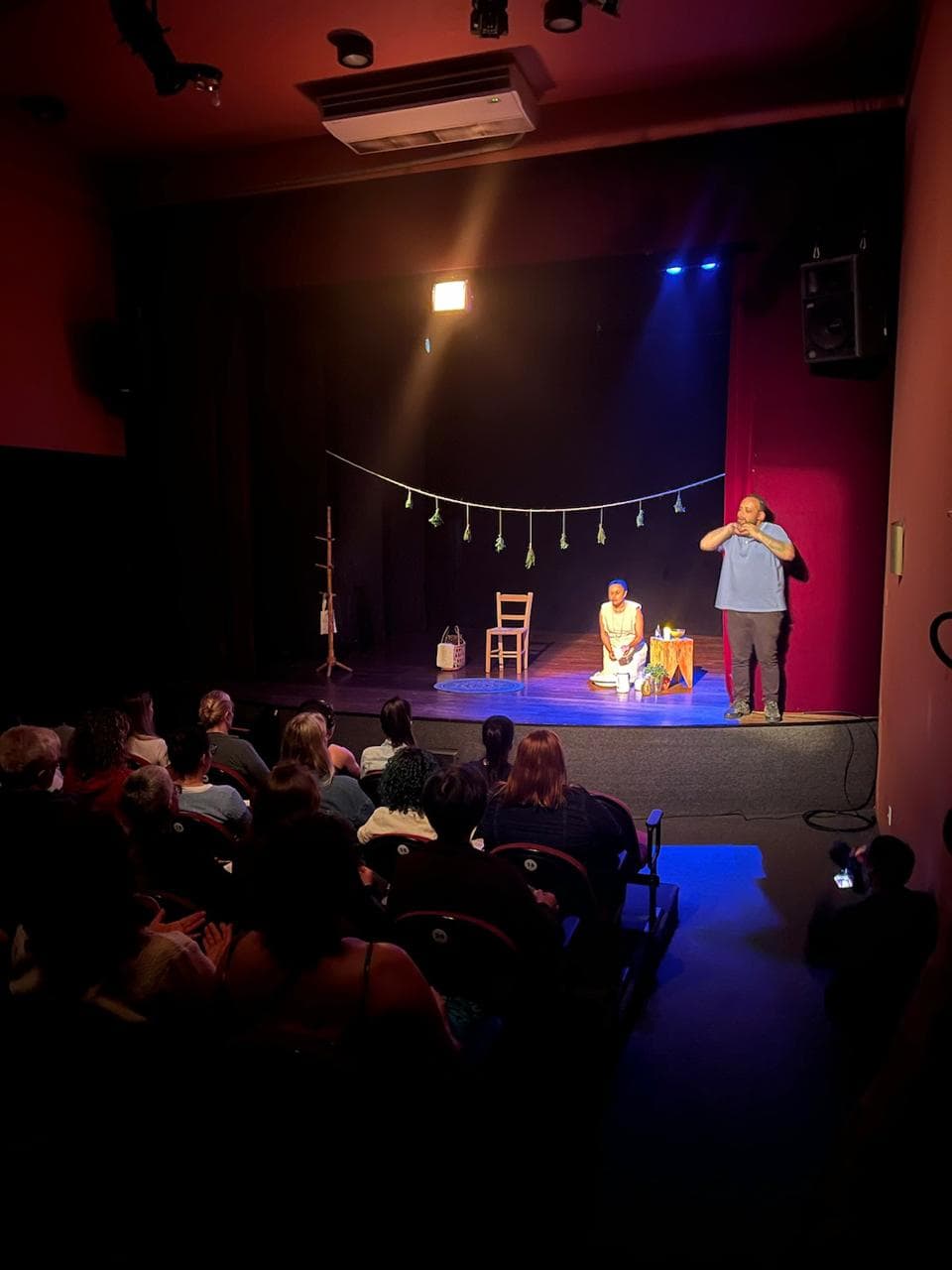 Quando o Roda de Benção foi para o palco do teatro, a direção artística foi assinada por Vanessa Garcia e toda a proposta cênica foi pensada para encantar, mas também para ir além da benção invisível com cenário, música e cenas que apresentam o ofício de benzer numa perspectiva mais artística. Para a estreia da apresentação no Museu Cruz e Sousa, que será no auditório do local, alguns detalhes tiveram que ser adaptados, mas as falas se mantiveram.