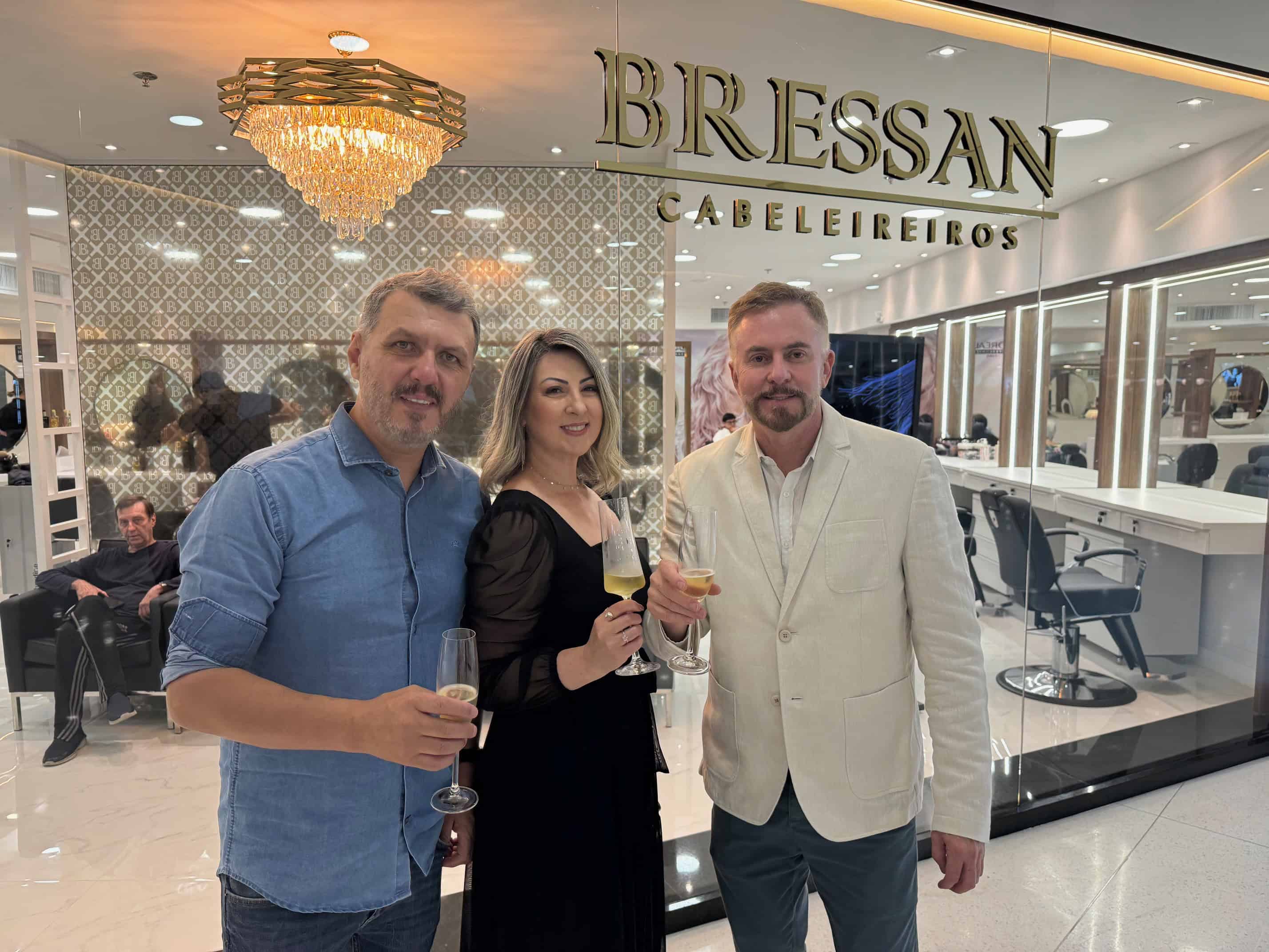 O empresário Bressan (foto, à direita), no comando de consolidada rede de salões de beleza com quatro unidades na Grande Florianópolis, brindou com o casal Luís Esteves e Soraia Barros, seus sócios na unidade do Villa Romana Shopping, nesta terça-feira (23/7), a abertura do novo salão, agora mais amplo, moderno e confortável, no recém-inaugurado Piso L3, ao lado de marcas conceituadas.