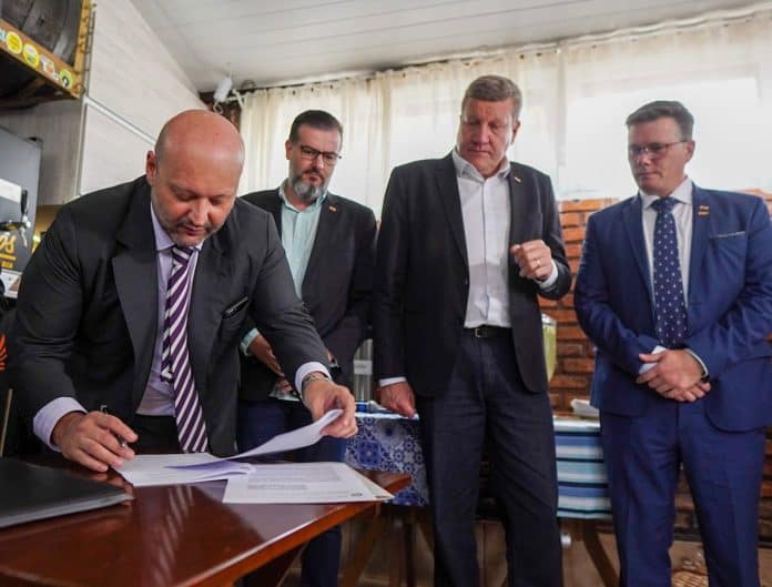 O Governo catarinense e a Câmara Brasil – Portugal de Comércio, Indústria e Turismo firmaram convênio para estimular a geração de negócios entre empresas do estado e o País europeu. A assinatura do documento foi feita pelo secretário Luciano Buligon, da Secretaria de Estado do Desenvolvimento Econômico Sustentável (SDE), e pelo presidente da Câmara, Jatyr Ranzolin Jr, nesta quinta-feira (31/03), em evento que reuniu empresários, autoridades e o embaixador de Portugal no Brasil, Luís Faro Ramos.