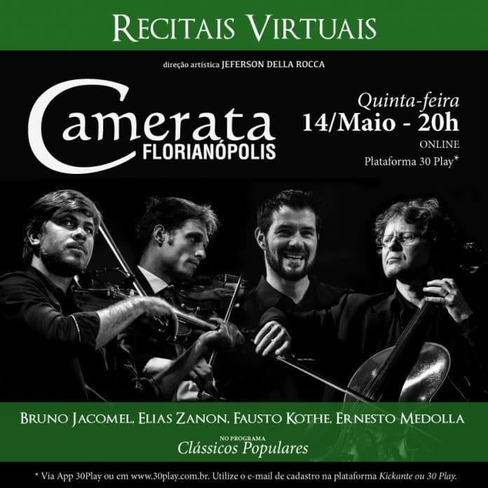 A segunda etapa dos Recitais Virtuais da Camerata Florianópolis começa nesta quinta-feira (14), às 20h. Depois de já ter realizado oito concertos online, a programação da orquestra recebe agora o quarteto de cordas formado pelos violinistas Bruno Jacomel e Elias Zanon, Fausto Kothe (viola) e Ernesto Guimarães Medolla (cello).