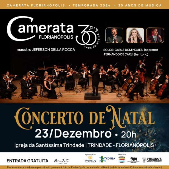 A Camerata Florianópolis apresenta o espetáculo “Concerto de Natal”, na Igreja da Santíssima Trindade, no bairro Trindade, em Florianópolis, no dia 23 de dezembro (segunda-feira), a partir das 20h. O concerto, que reúne clássicos como Jingle Bells e Ave Maria, tem entrada gratuita.