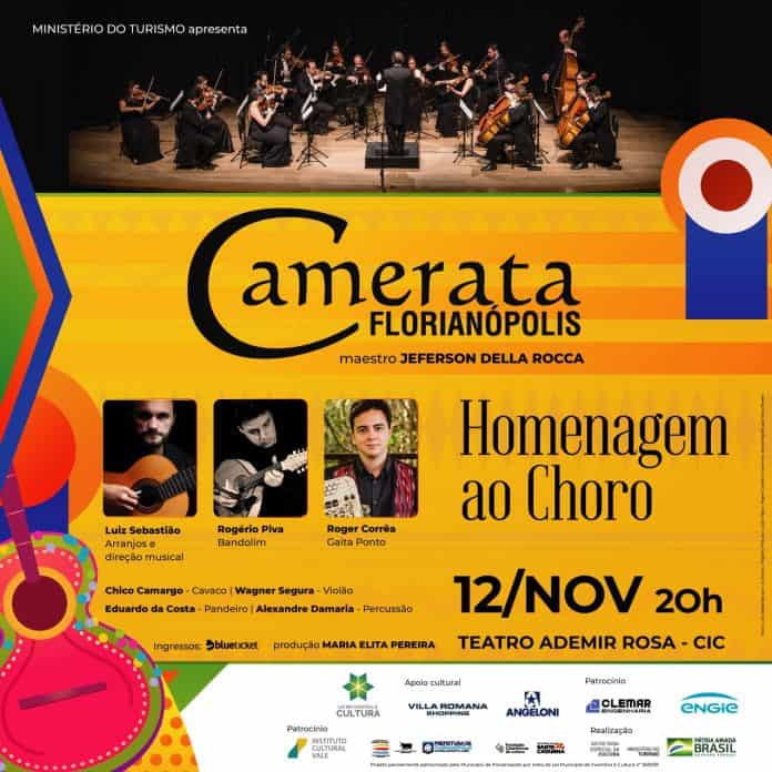 A Camerata Florianópolis irá dividir o palco com alguns dos maiores nomes do Choro catarinense no Teatro Ademir Rosa (CIC), na próxima sexta-feira (dia 12), às 20h. Sob a regência do maestro Jeferson Della Rocca, direção artística e arranjos de Luiz Sebastião Juttel, os músicos irão apresentar clássicos de Pixinguinha, Jacob do Bandolim, Radamés Gnattali, Waldir Azevedo e Paulinho da Viola. Os ingressos estão à venda pelo site Blueticket e na sede da Camerata Florianópolis.
