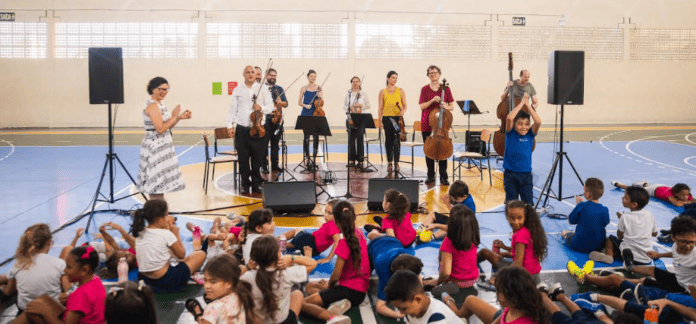 O octeto de cordas da Camerata Florianópolis voltou a apresentar em algumas escolas públicas da Grande Florianópolis o Concerto “Villa Lobos para Crianças”. O primeiro estabelecimento de ensino a receber os músicos foi a E.E.B. José Boiteux, no Estreito, na última quarta-feira. Na sexta, os músicos estiveram de manhã na escola E.E.B José Basílico e a tarde na E.E.B Prof. Alexandre Sergio Godinho. Ambas em Biguaçu.