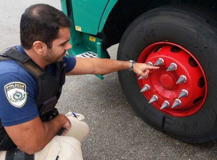 Policiais rodoviários federais flagraram neste domingo, 2, na BR 101 em Biguaçu, na Grande Florianópolis, um caminhão com capa de parafuso pontiaguda nas rodas, lembrando espinhos.