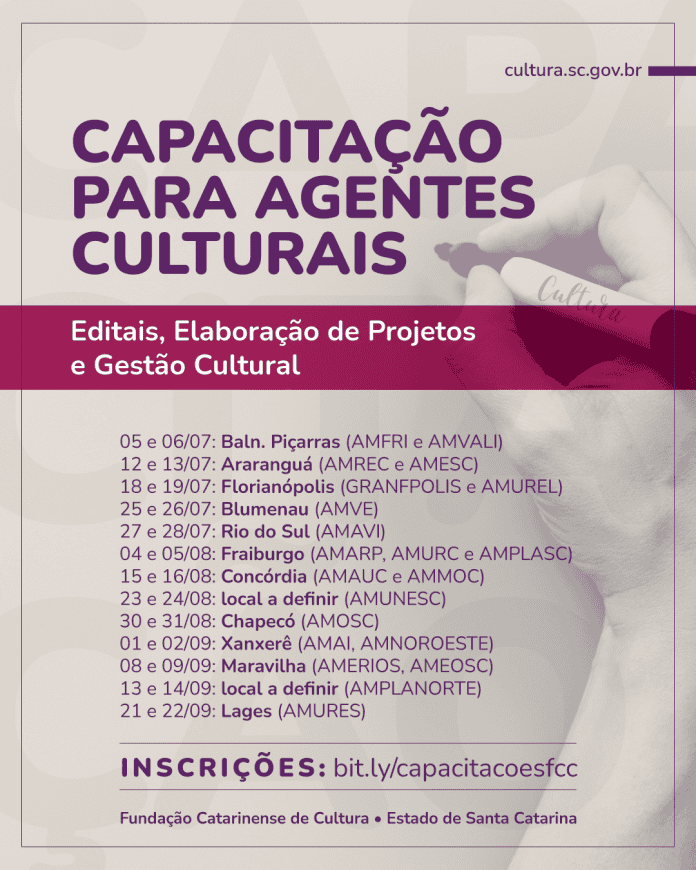 Estão abertas as inscrições para o Programa de Capacitação em Elaboração de Projetos para Editais de Cultura que a Fundação Catarinense de Cultura (FCC) realizará, por meio de oficinas presenciais, em 13 cidades catarinenses (confira o cronograma abaixo). A iniciativa tem parceria com a Federação Catarinense de Municípios (FECAM), o Conselho dos Gestores Municipais de Cultura (CONGESC) e as Associações de Municípios.