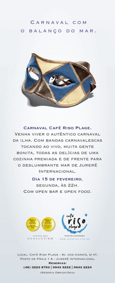 Na segunda-feira dia 15 de fevereiro acontecerá a primeira Festa Café Riso Plage. A decoração da casa instalada à beira mar da praia de Jurerê Internacional foi toda inspirada nos elementos circenses. Durante o evento haverá participação especial de artistas de circo com intervenções artísticas.