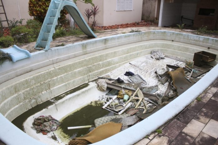 Denunciado pelas redes sociais e notificado pela equipe do Programa de Combate à Dengue da Secretaria Municipal de Saúde, o proprietário de um imóvel abandonado no Jardim Atlântico, na região continental de Florianópolis, iniciou a demolição da casa e a limpeza do local nesta terça-feira, 8. Caso não o fizesse em sete dias, seria denunciado o Ministério Público. Conforme noticiou o DeOlhoNaIlha nesta segunda-feira, 7, uma piscina cheia oferecia condições de proliferação do mosquito Aedes aegypti,
