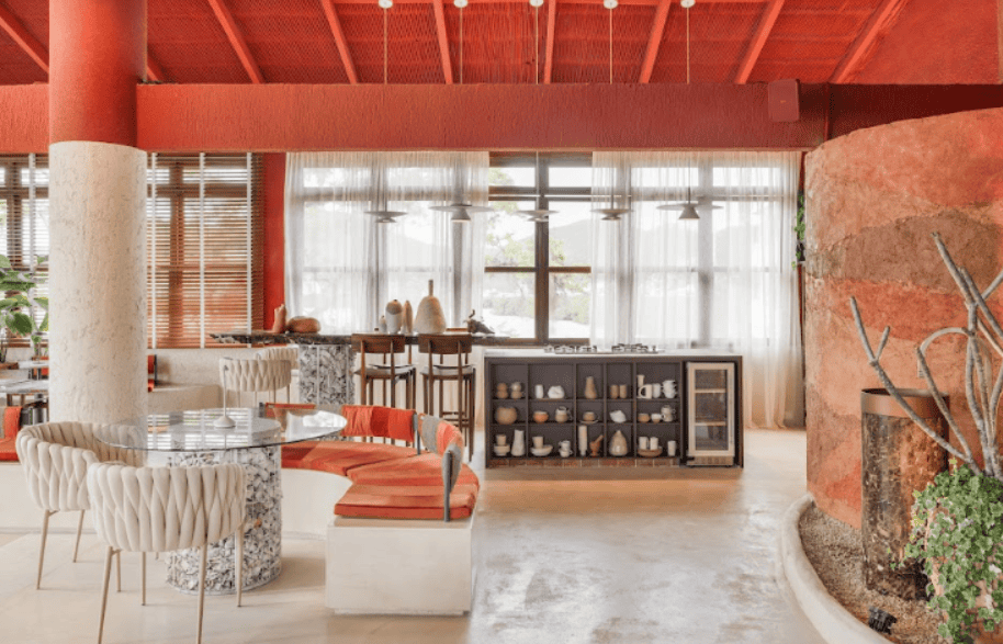 Na decoração, o espaço valoriza o uso de cerâmicas e tapeçarias decorativas feitas de insumos naturais e obras de arte feitas a partir de resíduos, como folhas e galhos secos e lixo reciclado.