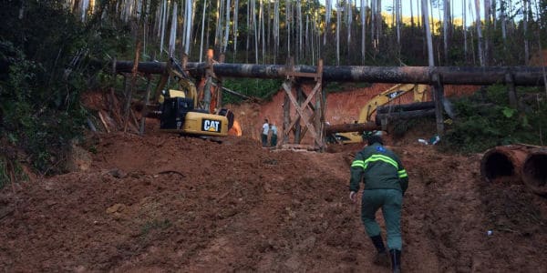 A adutora já está totalmente assentada sobre as pilastras reconstruídas na área que sofreu um grande deslizamento de terra na madrugada de domingo em função das chuvas.