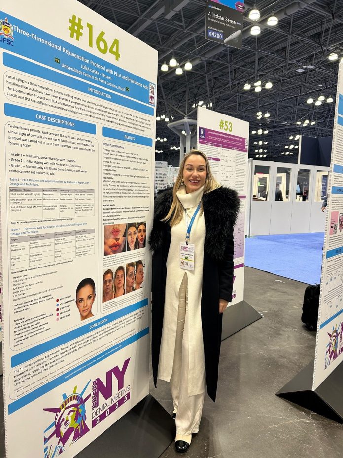A farmacêutica esteta Luísa Caser, especialista em harmonização facial e reconhecida por sua precisão técnica aliada a uma estética natural, acaba de conquistar mais um marco em sua trajetória profissional. Única farmacêutica catarinense — e uma das poucas brasileiras — a ter um trabalho selecionado para esta edição, ela publicou seu pôster científico no Greater New York Dental Meeting (GNYDM), maior Congresso de Odontologia da América do Norte, que reuniu mais de 45 mil inscritos entre 28 de novembro e 3 de dezembro de 2025, em Nova York. O congresso teve cerca de 200 artigos científicos publicados, sendo apenas 18 deles enviados por profissionais do Brasil.