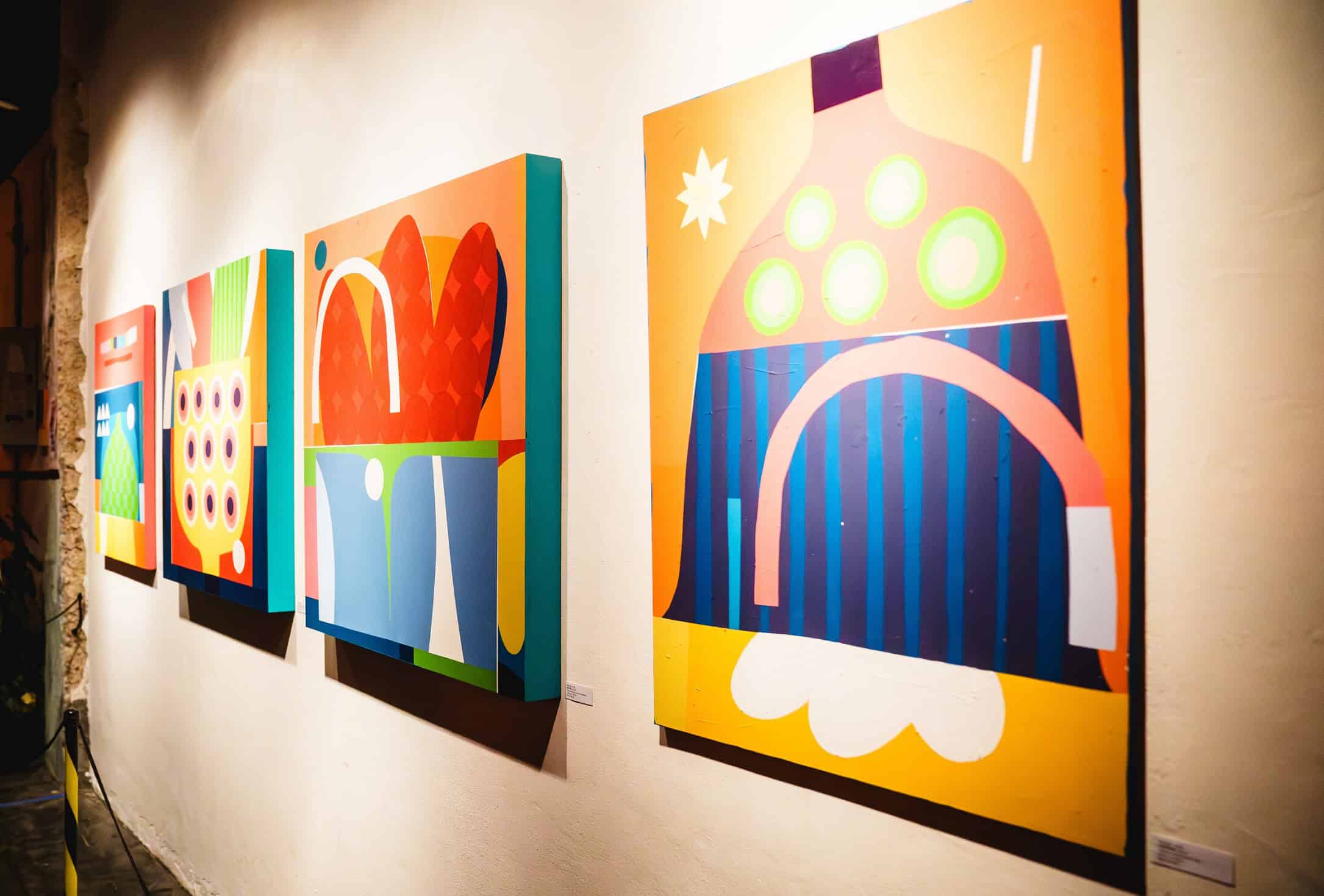 Já as pinturas de Levél, que são realizadas com tinta acrílica sobre telas, lonas e painel de madeira, instigam pela construção de camadas de tintas que transitam entre a precisão da linha reta geométrica em contraste com a fluidez orgânica. Além disso, é possível perceber um aprofundado estudo das cores para as suas composições estéticas. “Essa complexa combinação entre cores e formas provoca diferentes interpretações, emoções e sensações nas pessoas”, ressalta a curadora.