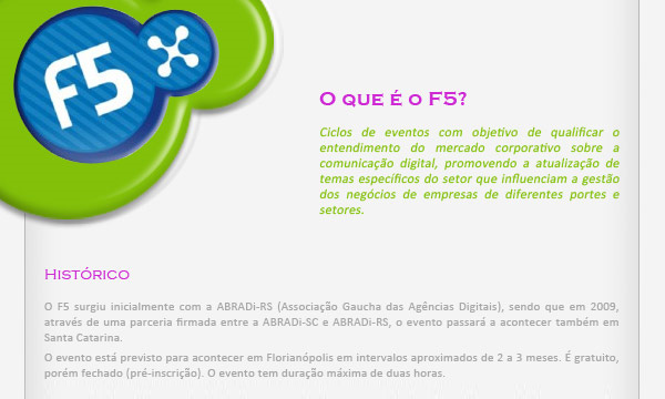 O F5, surgiu inicialmente a ABRADi-RS (Associação Gaucha das Agências Digitais), sendo que neste ano através de uma parceria firmada entre a ABRADi-SC e ABRADi-RS o evento passará a acontecer também em Santa Catarina.