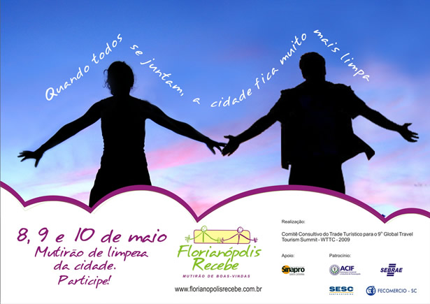 Os cartazes e flyers que serão entregues foram propostos pela Câmara de Divulgação, liderada pelo Sinapro/SC. “O WTTC está servindo de estímulo para que inúmeras entidades trabalhem unidas. O Sinapro apostou nessa integração e estamos felizes por podermos contribuir para que a cidade colha os benefícios do evento”, diz o presidente do Sindicato das Agências de Propaganda, Daniel Araújo. As peças têm como slogan a frase “Quando todos se juntam a cidade fica muito mais limpa” e pretendem estimular as pessoas a participar de um grande mutirão de limpeza e embelezamento das ruas previsto para ocorrer nos dias 8, 9 e 10 de maio. “O Florianópolis Recebe” é uma ação de sensibilização para todos os habitantes da capital cuidarem melhor da sua cidade. Com isso, todos estarão ganhando – nós, moradores, e os turistas, já que a idéia central é perenizar”, diz o diretor do Sinapro/SC, Kiko Silva, e da TZQG, agência que produziu o material. Além dos cartazes, banners e flyers, também foram produzidas camisetas especialmente para a ação. Para obter mais detalhe sobre a campanha, o site na internet é o www.florianopolisrecebe.com.br .