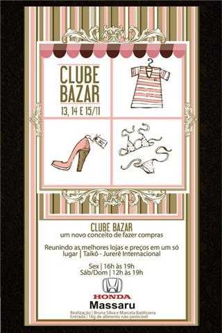 O Clube Bazar quer oferecer às mulheres de Florianópolis um novo conceito de bazar. Um jeito agradável, divertido e econômico de fazer compras. Para isso, juntou as melhores lojas de Florianópolis oferecendo descontos imperdíveis em um dos lugares mais agradáveis da cidade, Taikô em Jurerê Internacional.
