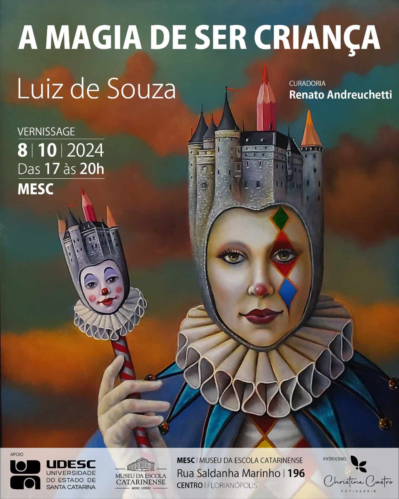 Natural de Lauro Muller (no Sul de Santa Catarina) e com quadros espalhados nos Estados Unidos e em vários países da Europa, o artista plástico Luiz de Souza fará exposição individual de suas obras pela primeira vez em Florianópolis. “A Magia de Ser Criança”, com curadoria de Renato Andreuchetti, estará no Museu da Escola Catarinense (MESC), no centro de Florianópolis, de 9 a 27 de outubro. O vernissage de abertura acontecerá no dia 8, das 17h às 20h. Uma série impactante de óleos sobre tela será apresentada com a temática principal do artista: a infância e o imaginário. O intuito é aproximar as crianças da arte e introduzir a visão artística no mês destinado a elas.