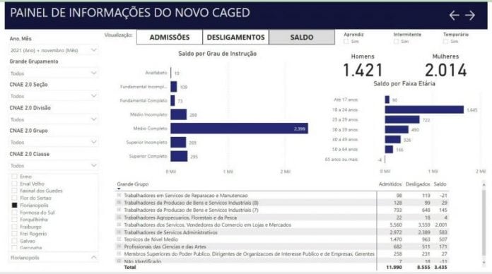 O Caged (Cadastro Geral de Empregados e Desempregados) divulgou o número de vagas de trabalho geradas no município de Florianópolis entre janeiro e novembro de 2021. Foram 12.796 empregos com carteira assinada em termos líquidos – admissões menos demissões. Considerando as 9.222 vagas perdidas o ano inteiro de 2020, o saldo positivo chega a 3.435 novos postos de trabalho, sendo cerca de 2.000 no setor de comércio e serviços.