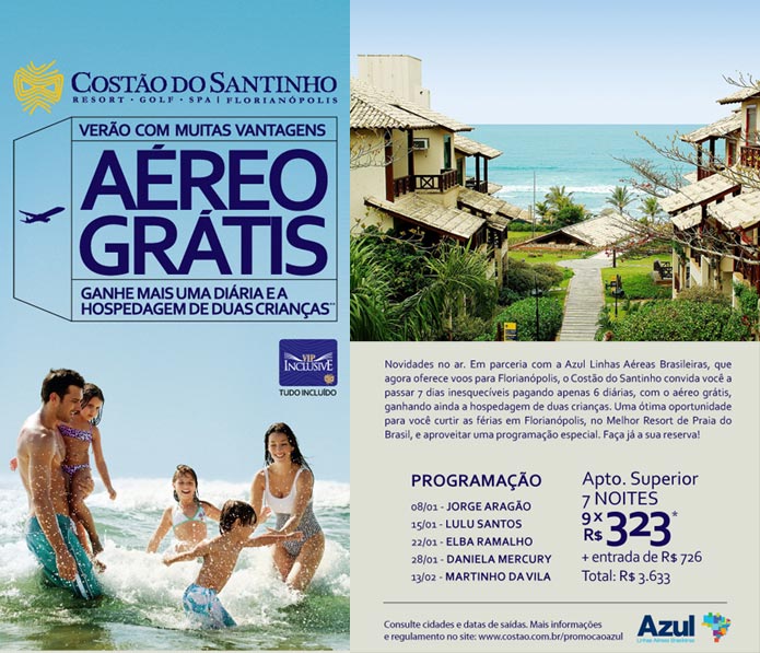 Uma parceria firmada entre o Costão do Santinho e a Azul Linhas Aéreas Brasileiras oferece passagens aéreas grátis para os hóspedes durante toda a temporada de verão, que inclui shows de Jorge Aragão (dia 08/01), Lulu Santos (15/01), Elba Ramalho (22/01) e Daniela Mercury (28/01). A promoção é válida também para o carnaval, que contará com o show de Martinho da Vila.