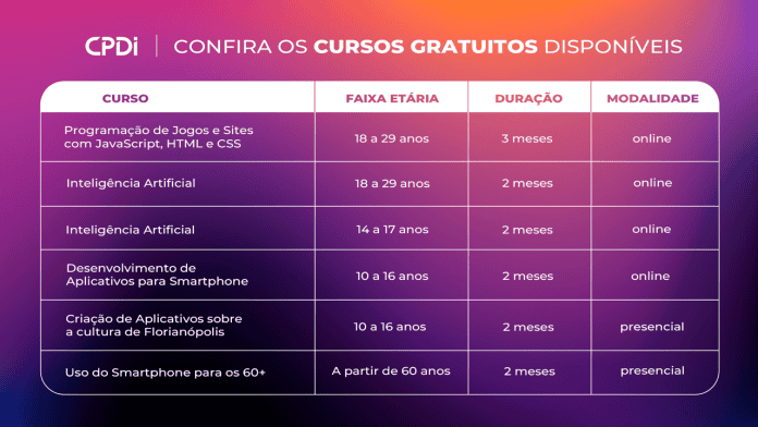 O CPDI está com inscrições abertas para uma série de cursos gratuitos voltados ao desenvolvimento tecnológico e à inclusão digital de crianças, jovens, adultos e idosos. Com modalidades online e presenciais, os cursos atendem públicos diversos, com idades a partir dos 10 anos até pessoas com mais de 60.