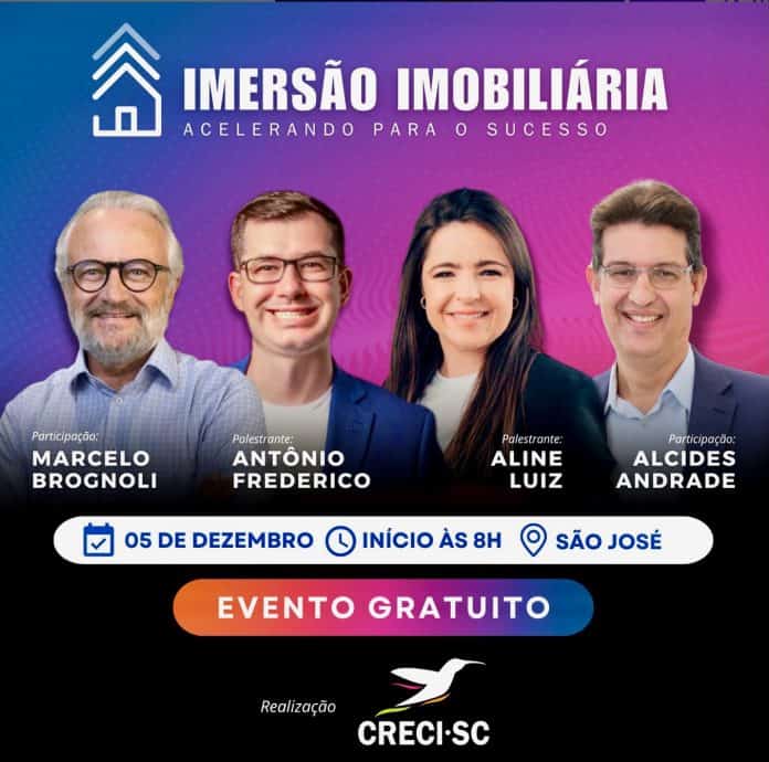A primeira “Imersão Imobiliária: Acelerando para o Sucesso” acontece no próximo dia 5 de dezembro, com credenciamento às 8h e início às 8h30, no Centro de Eventos Terra Firme, em Barreiros – São José. Restam poucas vagas e as inscrições já estão abertas aqui: https://www.sympla.com.br/evento/imersao-imobiliaria-acelerando-para-o-sucesso/2732414.