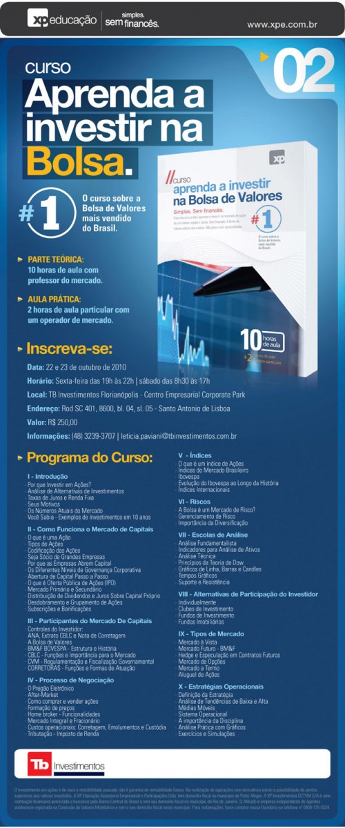 VOCÊ VAI APRENDER A VISÃO GERAL SOBRE O MERCADO DE CAPITAIS, O PROCESSO DE COMPRA E VENDAS DE ATIVOS NA BOLSA E VALORES, COMO IDENTIFICAR ATIVOS SUBVALORIZADOS OU SOBREVALORIZADOS, FAZER ANALISES GRAFICAS E FUNDAMENTALISTAS, OPERAR MERCADOS A VISTA, A TERMO, OPÇOES E DE FUTUROS, OPERAR EM MERCADOS DE ALTA, BAIXA OU LATERALIZADO, UTILIZAR TODOS OS RECURSOS OFERECIDOS PELO HOME BROKER XP.