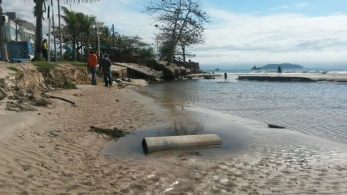 Com a chuva, o volume do rio do Brás avançou sobre a barreira de areia, causando estragos em pontos específicos da praia, mais especificamente em frente à rua Antônio Heil.