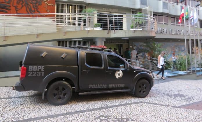 O Batalhão de Operações especiais da Polícia Militar (BOPE) vistoriou por mais de uma hora o prédio da Câmara Municipal de Florianópolis, no Centro da cidade, na tarde desta quarta-feira, 16.