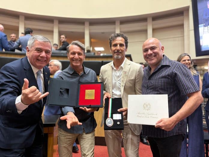 A Assembleia Legislativa de Santa Catarina viveu uma noite especial nesta segunda-feira (8), durante a Sessão Solene em que a banda Dazaranha recebeu a Comenda do Legislativo Catarinense – a mais alta honraria concedida pelo Parlamento estadual. A homenagem, proposta e entregue pelo deputado Mário Motta (PSD), reconhece mais de três décadas de contribuição cultural, social e artística da banda que se tornou um símbolo de identidade música catarinense.