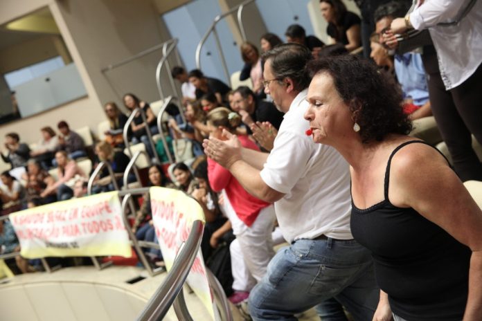 Os protestos fizeram com que o presidente da Assembleia, deputado Joares Ponticelli (PP), suspendesse a sessão por alguns minutos. Na retomada dos trabalhos, a deputada Ana Paula Lima, líder do PT no Parlamento, afirmou que sua bancada votaria contra a proposta.
