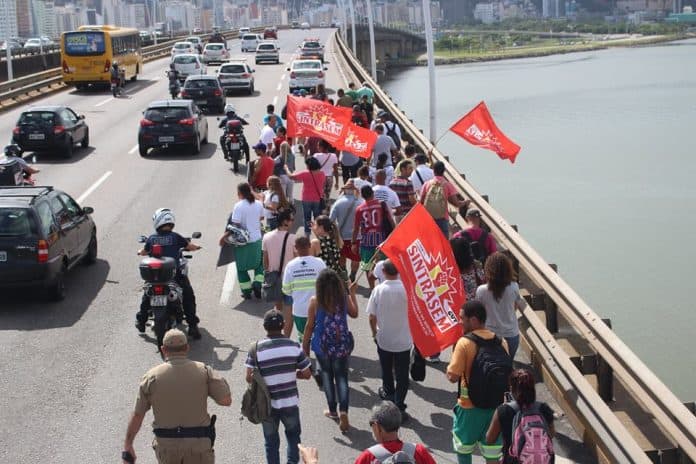 Florianópolis não ficou de fora. No período da manhã, os servidores da Comcap que paralisaram as atividades por 24 horas se dirigiram para o Centro da cidade em uma marcha por cima da ponte Pedro Ivo.