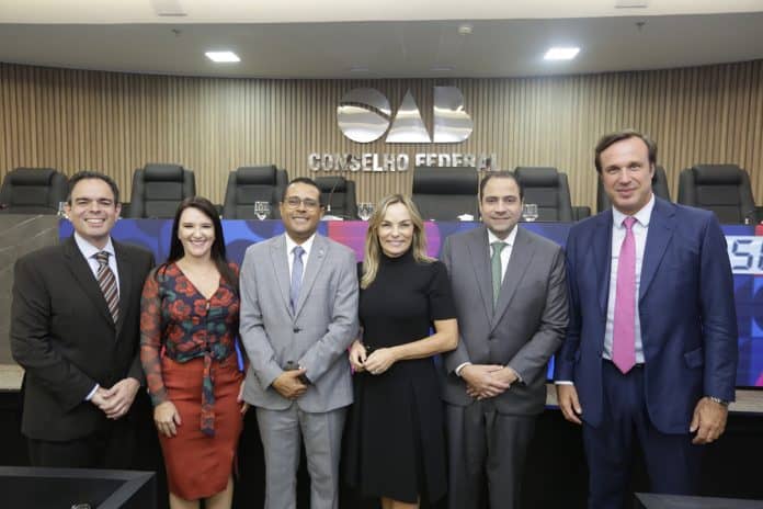 Legenda foto: Felipe Sarmento, coordenador-geral das Comissões no CFOAB, Cláudia Prudêncio, Marco Vinicius Pereira de Carvalho, Ana Cristina Blasi, Beto Simonetti, presidente da OAB Nacional, e Rafael Horn