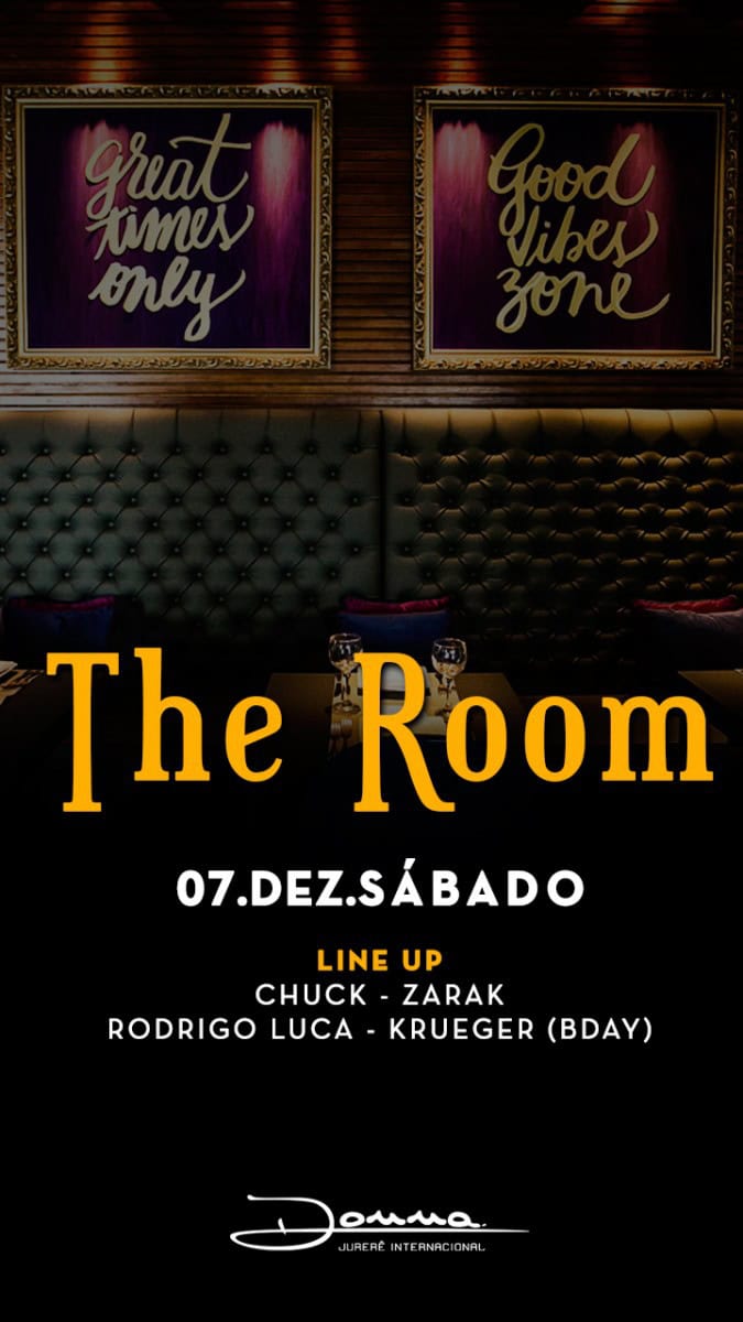 A noite de sábado (07) no Donna inicia o último mês do ano com a festa The Room. Neste final de semana, a casa conta com a presença dos DJ´s Rodrigo Luca, Krueger, Zarak e Chuck. As noites que começam a partir das 19h para o jantar entre amigos e a família se estendem para a pista de dança. A fusão da gastronomia e a música transformam o ambiente moderno e sofisticado do Donna o dining club mais badalado de Jurerê Internacional, com a gastronomia assinada pelo chefes peruanos Hugo Olaechea e Sara Sanchez.