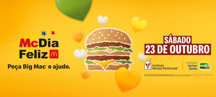 No próximo dia 23 de outubro, sábado, acontece a edição 2021 do McDia Feliz, uma das principais campanhas do país em arrecadação de recursos para causas infantojuvenis.Na data, toda a renda gerada com as vendas de sanduíches Big Mac em todos os restaurantes McDonald’s do Brasil será revertida para as iniciativas conduzidas pelo Instituto Ronald McDonald, que promove a saúde e a qualidade de vida de crianças e adolescentes com câncer e suas famílias, e pelo Instituto Ayrton Senna, que contribui para ampliar oportunidades para os jovens por meio da educação. Desde sua primeira edição, em 1988, a campanha já arrecadou mais de R$ 300 milhões.