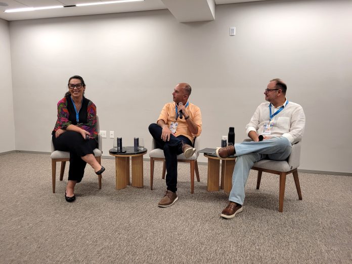Legenda foto: Carla Cabral Costa, Mario Costa Junior e Vini Luca na condução dos debates sobre turismo