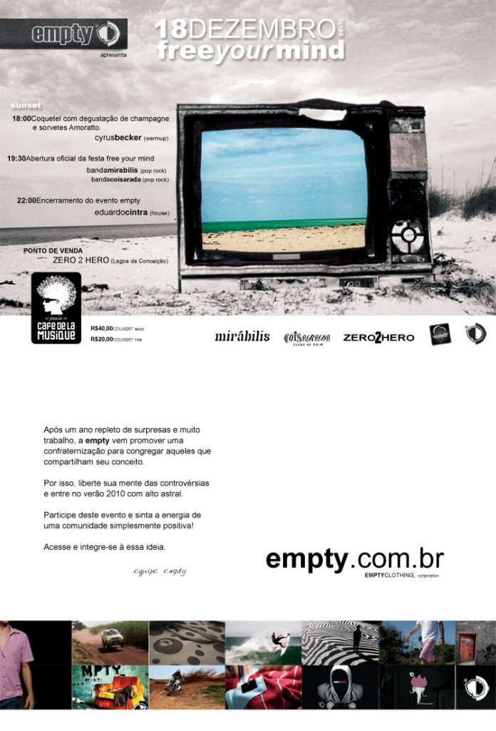Na próxima sexta-feira, dia 18, vai rolar uma festa bacana no Café de La Musique, em Jurerê Internacional: o Lançamento da coleção Verão 2010 da Empty. O sunset começa às 18h e vai marcar a comemoração dos cinco anos da marca catarinense de roupas de surf. Entre as atrações da festa estão as Banda Mirabilis e Coisarada e os DJs Cyrus Becker e Eduardo Cintra