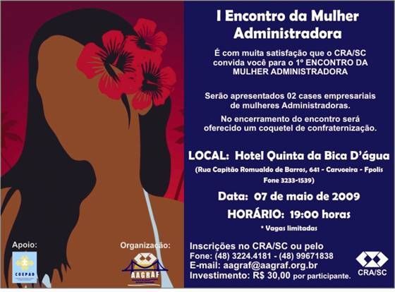 O Conselho Regional de Administração (CRA/SC) e a Associação dos Administradores da Grande Florianópolis (AAGRAF) promovem no próximo dia 7 de maio o 1° Encontro da Mulher Administradora. O evento terá como palestrantes as Administradoras Mariah Nascimento e Evanir Dario, que falarão de cases bem-sucedidos em que atuaram.
