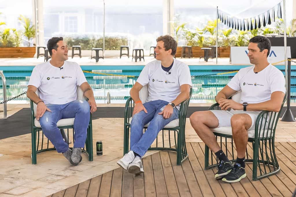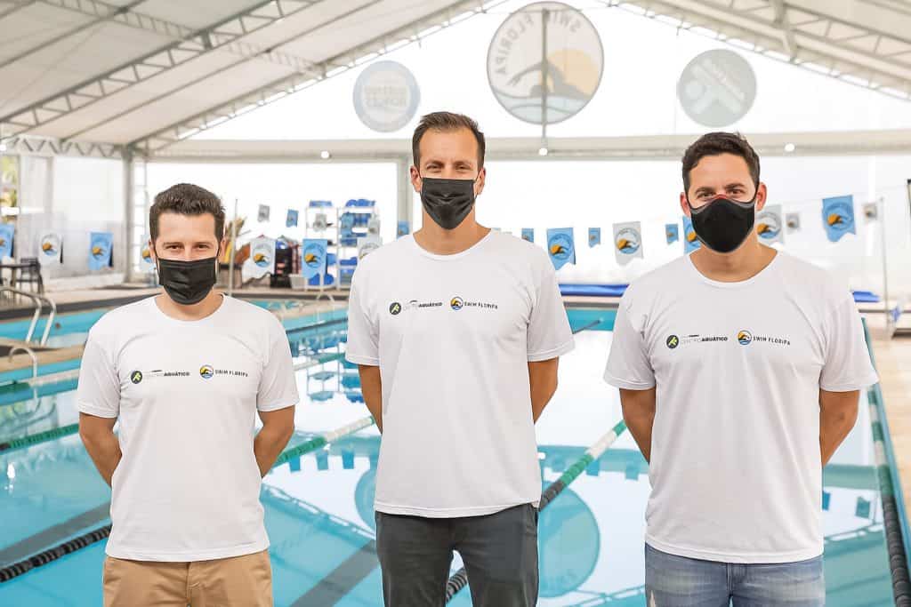 Os maiores medalhistas da natação brasileira, Gustavo Borges, César Cielo e Thiago Pereira, estiveram reunidos em Florianópolis para a inauguração do SwimFloripa, centro aquático que tem Thiago Pereira como um dos sócios, ao lado de Eduardo Deboni e Mateus Ribeiro.