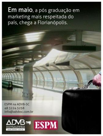 A ADVB/SC, através de seu presidente, Carlos Jofre do Amaral Netto, assinou com a ESPM-Escola Superior de Propaganda de Marketing, de São Paulo, a realização em Santa Catarina de cursos de Pós-Graduação em Marketing, com duração de 18 meses. O primeiro curso terá início no próximo dia 9 de maio, com 30 alunos que receberão aulas de professores da ESPM paulista