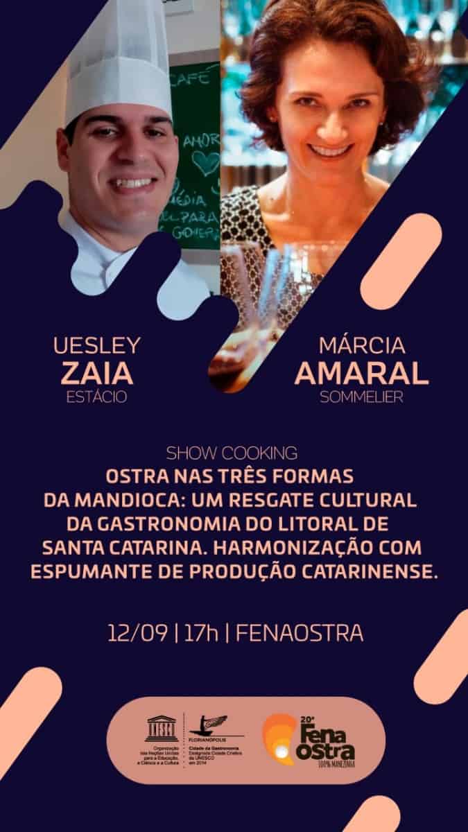 No dia 12 de setembro, o professor Uesley Henrique Zaia da Estácio Florianópolis apresenta o show cooking “Ostra nas três formas da mandioca: um resgate cultural da gastronomia do litoral de Santa Catarina”, com harmonização de um espumante catarinense. No Espaço Sebrae, vai dar orientações sobre o preparo da iguaria ao mesmo tempo em que se relaciona de forma interativa com o público com apoio da Sommelier Internacional pela FISAR, Márcia Amaral.